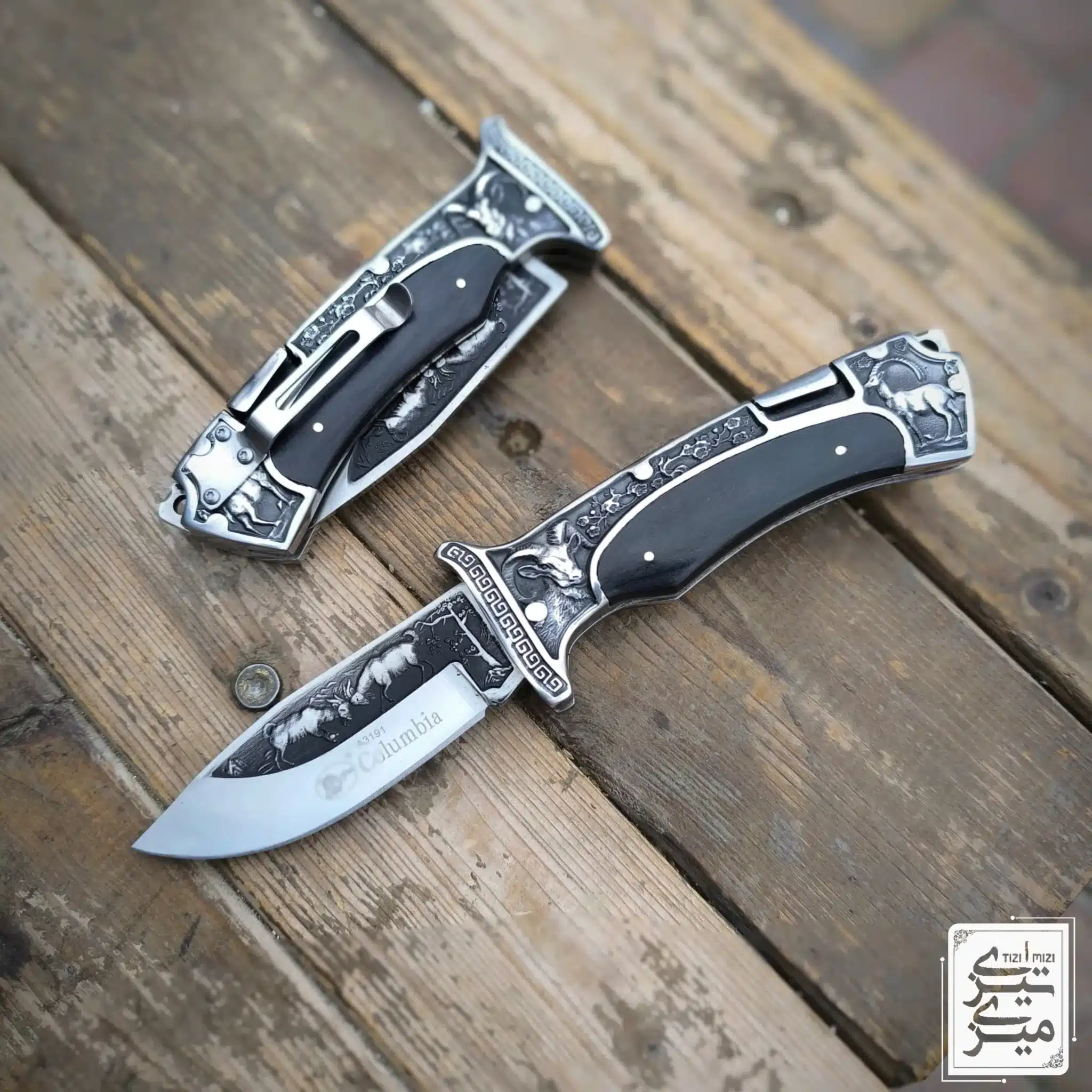 چاقوی جیبی مدل بز کلمبیا، ترکیبی از زیبایی هنری و کاربردی، با تیغه استیل ضدزنگ و دسته فلزی حکاکیشده، مناسب استفاده روزمره یا جمعآوری در کلکسیون